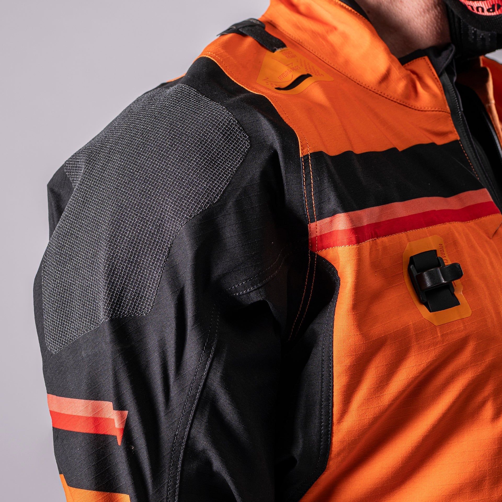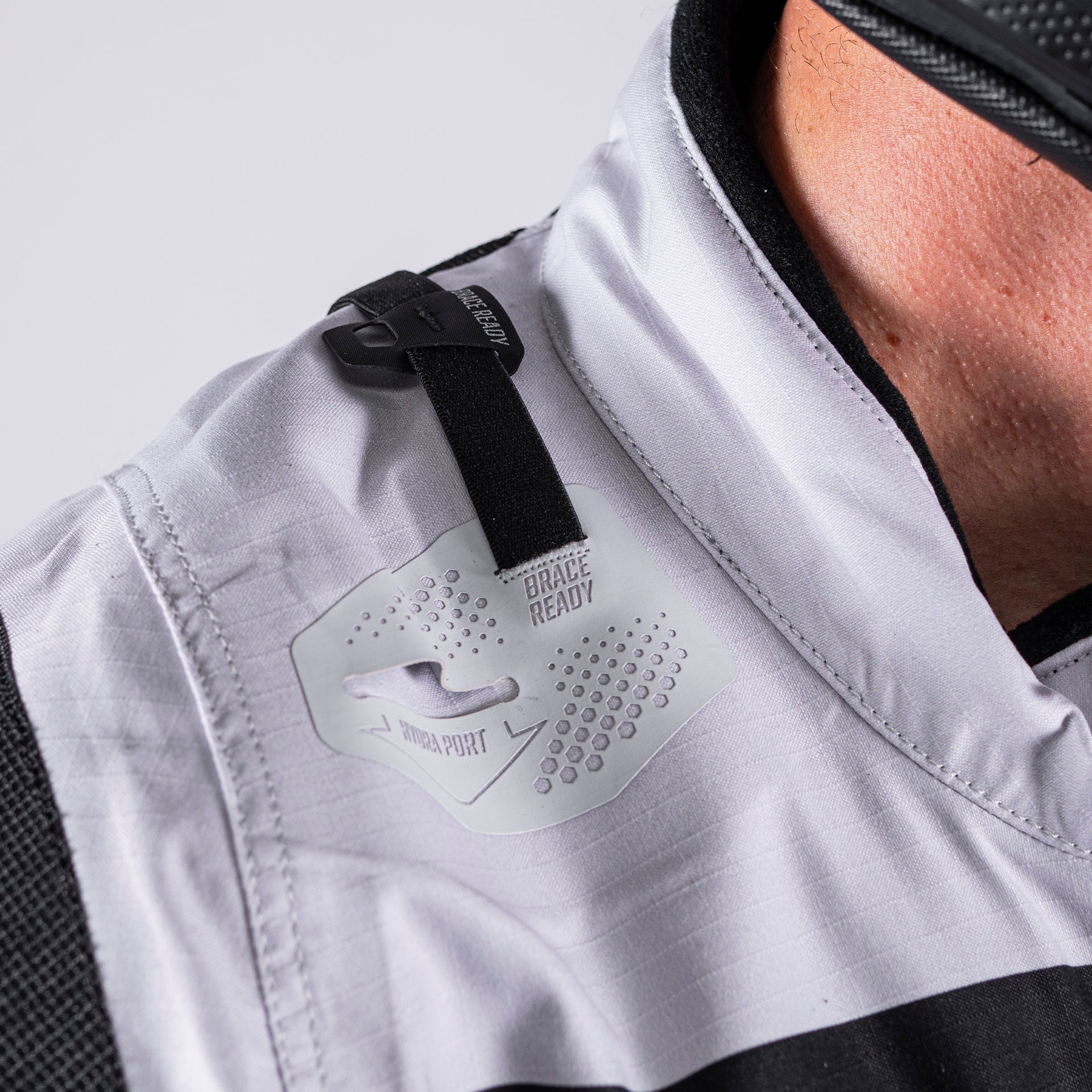 Jacket comes with “Brace On” Neck Brace fitting loops and unique neck brace thoracic insert on ventilation flap: