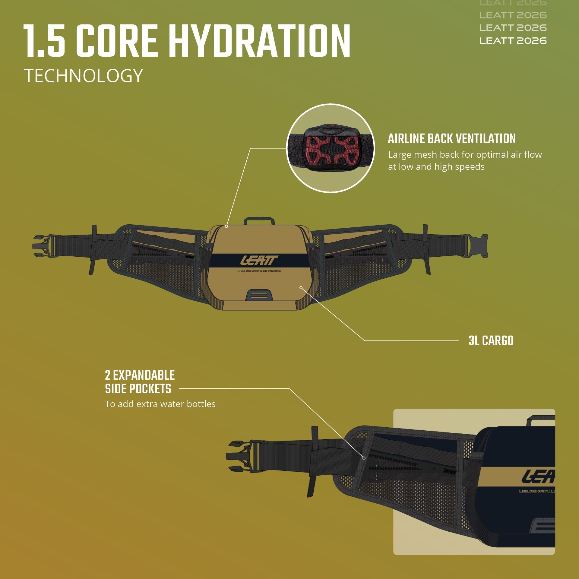 3.0L of cargo storage will give you enough room for the essentials with extra pockets on the waist belt.