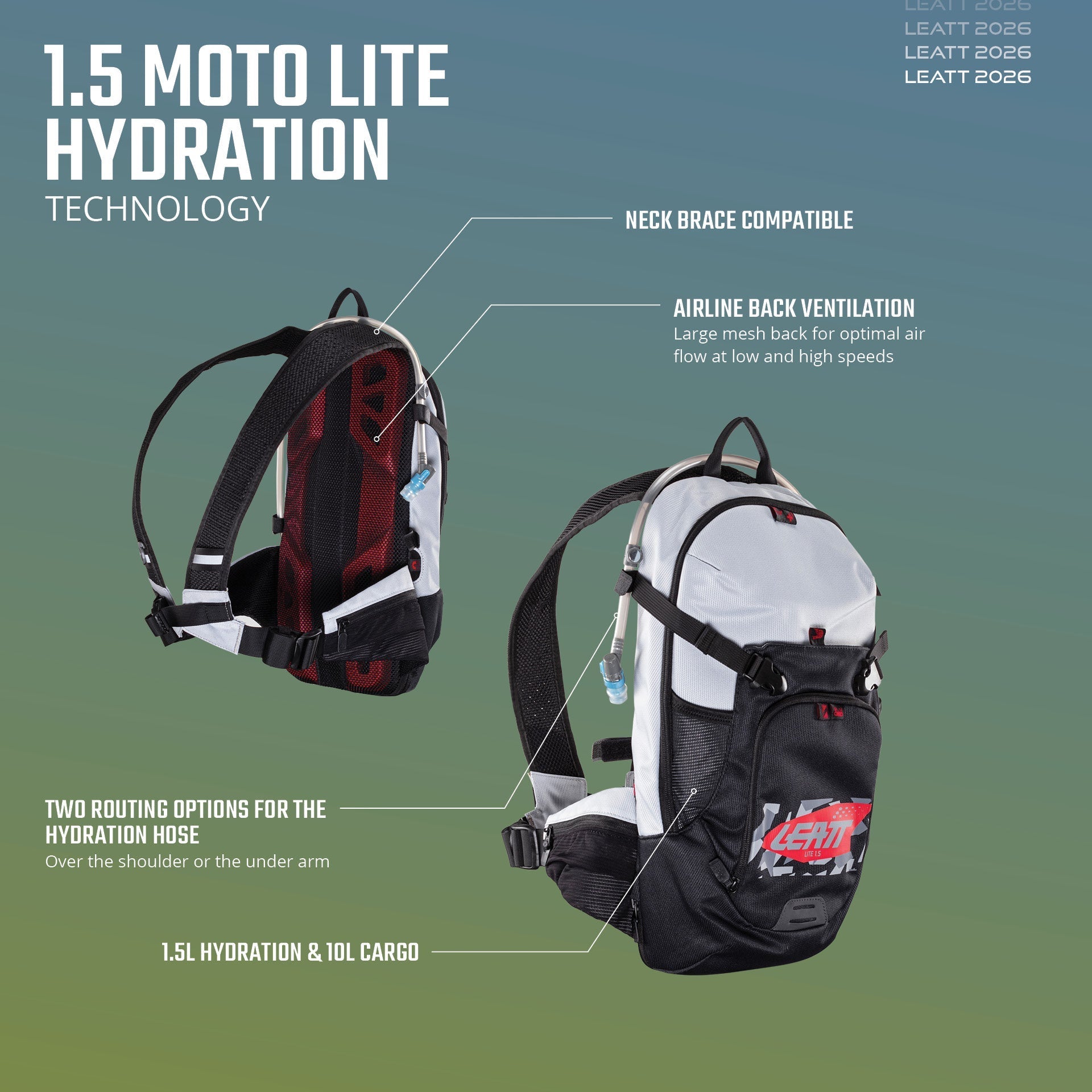 If you’re looking for added impact protection for your back, there is an option to fit a CE impact certified protector. Additional features include: a removable tool storage card, reflective safety piping, an emergency whistle, and a heat panel to keep liquids warm when needed. The Hydration Moto Lite 1.5 is constructed to fit with or without a Leatt neck brace.