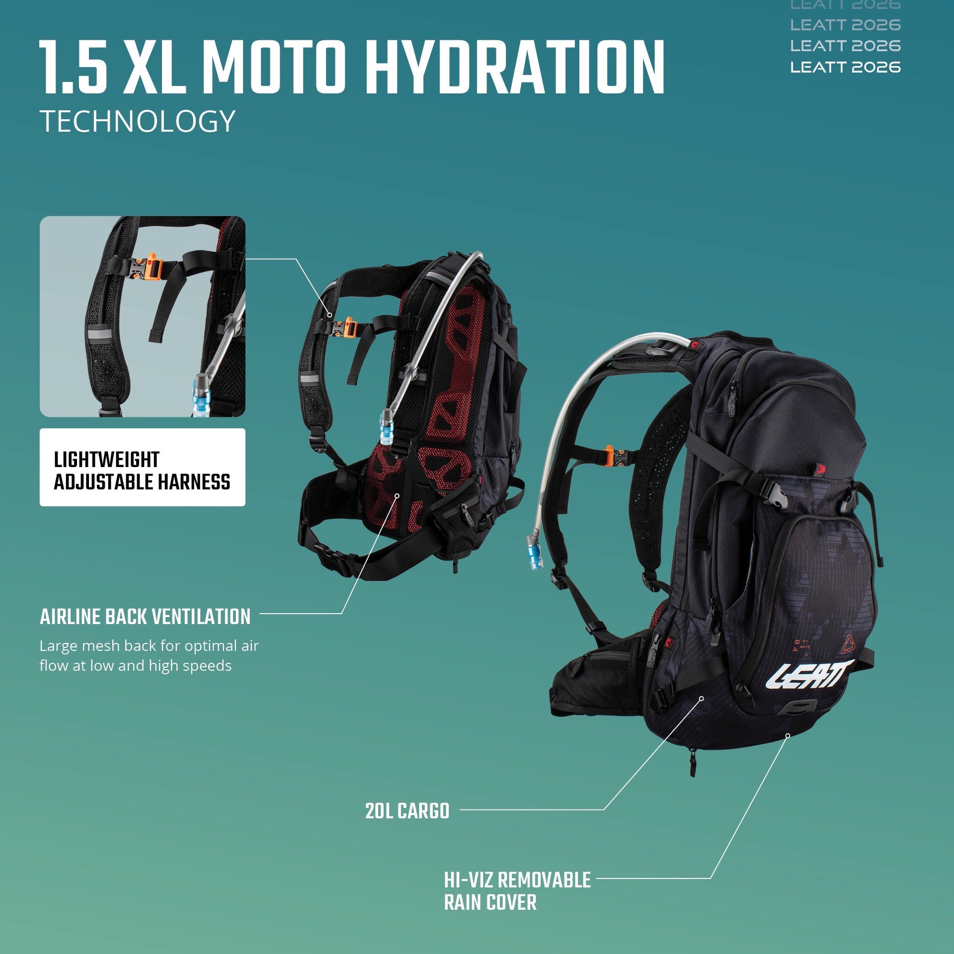 The Hydration Moto 1.5 XL has a 1.5L hydration bladder and a roomy 20L of cargo space. The lightweight harness system is fully adjustable across the chest and waist to ensure a rock-solid fit. AirLine back ventilation ensures optimal airflow, keeping you cool even on those long rides. The feed tube has an auto shut-off bite valve, and can be routed over-shoulder or under-arm.