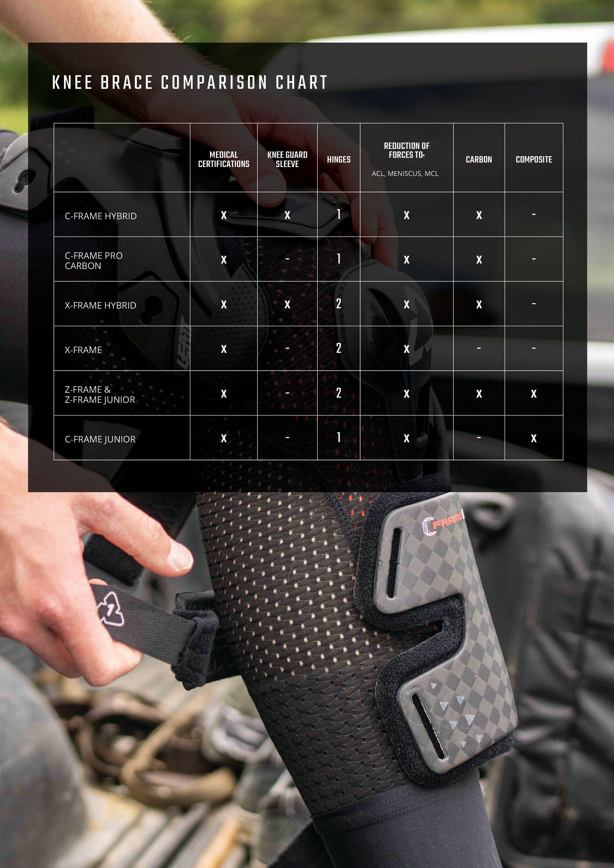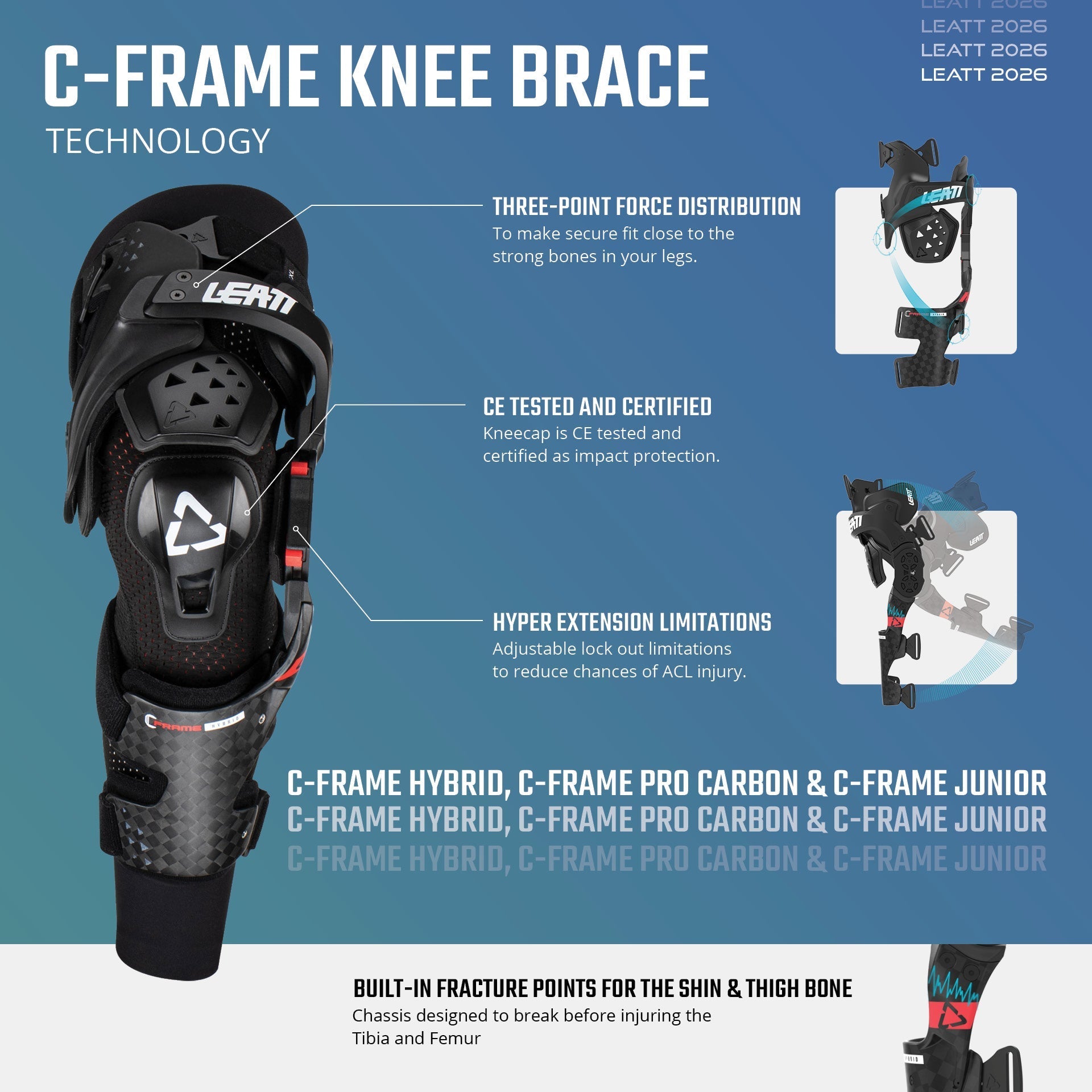 The C-Frame chassis is designed with built-in fracture points that break before you injure your shin or thigh bone. The inner knee provides superior bike feel, and the comfortable, low-profile shin bone plate fits perfectly inside your riding boots.