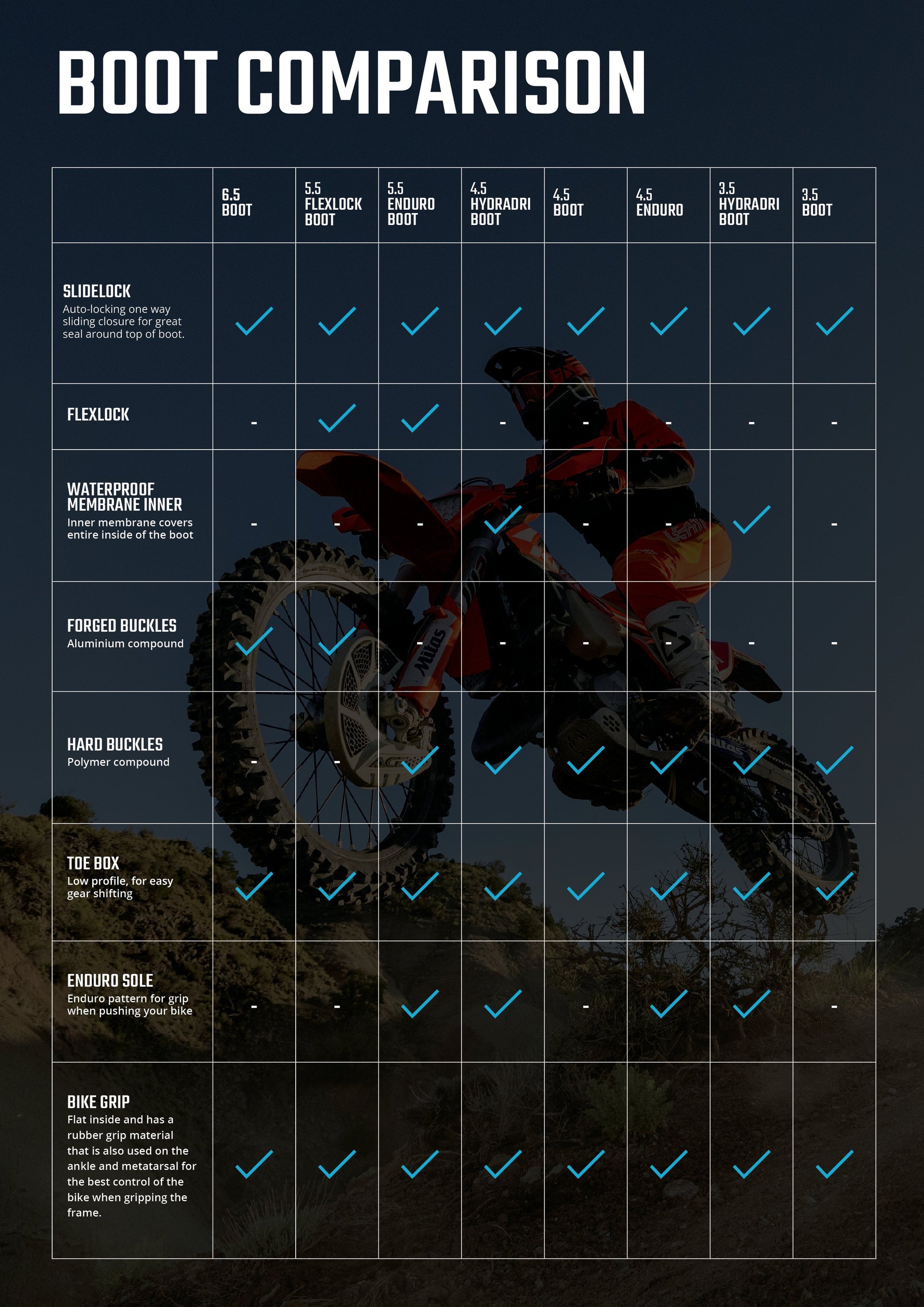 SOLE: Enduro pattern for grip when pushing the bike • DualZone hardness • Extended foot peg riding zone for arch and riding on the balls of your feet • Steel shank reinforced and CE certified